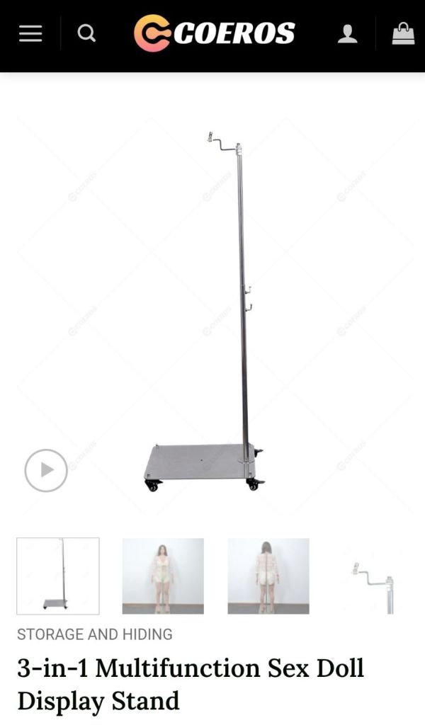 Lastly it can just be kind of something you use for storage. Carefully balancing your doll with either the crotch support stand or the neck attachment and evenly distributing the weight between the doll’s feet and other attachment point, you can leave a doll standing up for a longer time without risking damage to say the feet from warping under the weight of the doll’s skeleton. This is primarily concerning silicone dolls that have hard silicone feet for standing.
